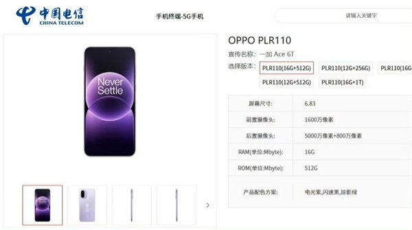 一加 Ace 6T 手機(jī)已現(xiàn)身中國(guó)電信終端產(chǎn)品庫(kù),提供 12GB+256GB、12GB+512GB、16GB+256GB、16GB+512GB、16GB+1TB 五種存儲(chǔ)規(guī)格,擁有電光紫、閃速黑、掠影綠三種配色,產(chǎn)品零售價(jià)格尚未公布。